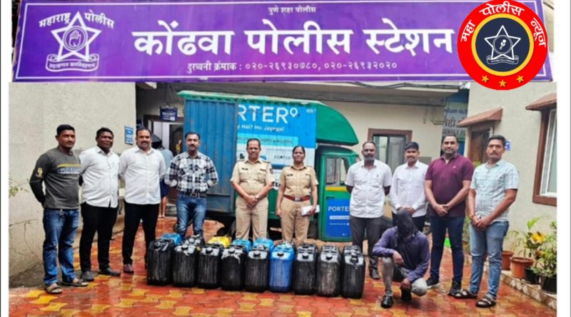 महा पोलिस न्यूज़ ! ऑनलाईन पुणे :- दिनांक १८/०८/२०२४ रोजी कोंढवा पोलीस स्टेशनचे तपास पथकाचे पोलीस अधिकारी व अंमलदार हे हद्दीमध्ये वाढलेल्या चोरीच्या घटनांच्या अनुषंगाने पेट्रोलिंग करत असताना पो.अं. सुरज शुक्ला, पो.अं. शाहीद शेख व पो.अं. लक्ष्मण होळकर असे इस्कॉन चौक ते गोकुळनगर या भागात पेट्रोलिंग करत आले असता दुपारी १३/३० वा. चे सुमारास गोकुळनगर कडे जाणा-या रोडवर पो.अं. सुरज शुक्ला यांना एक तिन चाकी पॅगो टेम्पो गाडी क्रमांक एम.एच/१४/जे.पी/१३५३ ही संशयितरित्या मिळुन आल्याने त्यांनी सदर तिन चाकी पॅगो टेम्पो गाडी रोडचे कडेला थांबवुन त्यामधील चालकास त्याचा नाव पत्ता विचारता त्याने त्याचे नाव अरबाज नजीर सय्यद वय २६ वर्षे रा. गल्ली नं.१७, सय्यदनगर, हडपसर, पुणे असे असल्याचे सांगितले. तेव्हा त्यास सदर गाडीमध्ये काय आहे याबाबत विचारणा केली असता त्याने उडवाउडवीची उत्तरे दिल्याने त्यास सोबत घेवुन पोलीस स्टेशन येथे आणुन सदर गाडीची तपासणी केली असता सदर पॅगो टेम्पो गाडीमध्ये काळे-निळे रंगाचे कॅण्डमध्ये गावठी हातभट्टीची दारु असल्याचे दिसल्याने लागलीच ड्युटी ऑफिसर मपोउपनि स्नेहल जाधव यांनी मा. विनय पाटणकर, वरिष्ठ पोलीस निरीक्षक, व मा.मानसिंग पाटील, पोलीस निरीक्षक (गुन्हे), कोंढवा पोलीस स्टेशन यांना कळवुन त्यांनी कारवाईबाबत आदेश दिल्याने त्यांचे आदेशाप्रमाणे दोन पंचांचे समक्ष सदर पॅगो टेम्पो गाडीची तपासणी करता त्यामध्ये ९८,५२५/- रु. किंमतीची देशी हातभट्टीची तयार दारुचे १९ कॅण्ड प्रत्येक कॅण्डमध्ये ३५ लिटर दारु अशी एकुण ६६५ लिटर दारु तसेच २,००,०००/- रु. किंमतीचा तिन चाकी पॅगो टेम्पो गाडी क्र. एम.एच/१४/जे.पी/१३५३ असलेला असा एकुण २,९८,५२५/- रु. किंमतीचा मुद्देमाल मिळुन आल्याने तो आरोपी नामे अरबाज नजीर सय्यद वय २६ वर्षे रा. गल्ली नं. १७, सय्यदनगर, हडपसर, पुणे याचे ताब्यातुन जप्त करण्यात आला आहे.