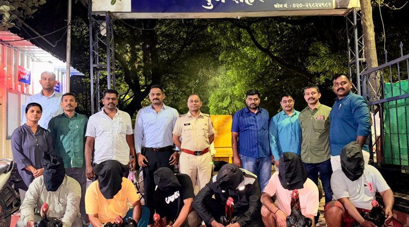 महा पोलीस न्यूज ! ऑनलाईन पुणे :- दि.१९/१०/२०२५ रोजी वानवडी पोलीस स्टेशन तपास पथकातील पोलीस अधिकारी व अंमलदार हे पोलीस स्टेशन हद्दीमध्ये पेट्रोलींग करीत असताना, तपास पथकाचे पोलीस अंमलदार गोपाळ मदने व अमोल पिलाणे यांना त्यांचे गुप्त बातमीदारांमार्फत बातमी मिळाली की, इम्प्रेस गार्डनये पाठीमागे, बंगला नंबर २ जवळ, रस्त्यालगत मोकळया जागेत, घोरपडी, पुणे येथे सार्वजनीक ठिकाणी पाच ते सहा इसम हे पैशावर कोंबड्याची झुंज लावुन, त्यावर जुगार खेळत आहेत. अशी खात्रीशीर बातमी मिळाल्याने तपास पथकाचे अधिकारी व अंमलदार यांनी सदर ठिकाणी जावुन खात्री करुन बातमीतील वर्णनाचे इसम हे नमुद ठिकाणी एकुण ०६ कोंबडांची पैशावर झुंज लावुन त्यावर पैशाची बाजी लावुन हार जीतचा खेळ खेळत असतांना मिळुन आल्याने सापळा रचुन अचानकपणे छापा टाकुन पैशांवर कोंबड्यांची झुंज लावणारे ०६ इसर्माना जागीच पकडले. त्यांना त्यांची नावे पत्ते विचारता त्यांनी त्यांची नावे १) अमोल सदाशिव खुर्द वय ४७ वर्षे रा. रविवार पेठ, पुणे २) मंगेश आप्पा चव्हाण वय ५५ वर्षे रा. भवानी पेठ, पुणे ३) निखिल मनिष त्रिभुवन, वय २० वर्षे रा. घोरपडी पुणे, ४) अमिर आयुब खान, वय २८ वर्षे रा. घोरपडीगांव, पुणे, ५) सचिन सदाशिव कांबळे, वय ४२ वर्षे रा. भवानी पेठ, पुणे ६) प्रणेश गणेश पॅरम, वय २७ वर्षे रा. कॅम्प, पुणे अशी असल्याचे सांगुन ते सदर ठिकाणी पैशावर कोंबड्यांची झुंज लावुन त्यावर पैशाची बाजी लावुन हार जीतचा खेळ खेळत असलेबायत सांगीतले. सदरवेळी त्यांचेकडुन सदरचे ६ रंगीबेरंगी कोंबडे व त्यांची ने-आण करण्यासाठी आरोपीतांनी वापरलेल्या तंगुसच्या ६ पिशव्या, ३ मोटारसायकल, ५ मोबाईल हॅन्डसेट, २५८०/-रु. रोख रक्कम इत्यादी एकुण ५,११,८८०/-रु.कि.चा मुद्देमाल हस्तगत्त करण्यात आला आहे. नमुद सर्व आरोपीतांविरुध्द वानवडी पोलीस स्टेशन येथे गु.र.नं.४२४/२०२५ महाराष्ट्र जुगार प्रतिबंधक कायदा कलम १२ (ब) व प्राण्यांना कुरपणे वागणुक देण्यास प्रतिबंध करणेबाबतचा अधिनियम कलम ११ (इ) (न) अन्वये गुन्हा दाखल करण्यात आलेला आहे.